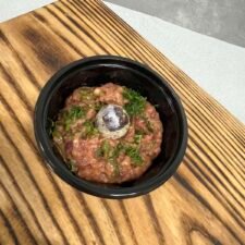 Sudedamosios dalys: Jautienos kumpis, dijono garstyčios, marinuoti agurkėliai, kaparėliai, marinuoti, juoduota druska, juodieji pipirai, soja, vorčesterio padažas česnakai, svogūnai, putpelės