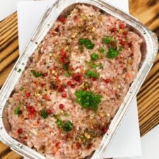 Sudedamosios dalys: vištienos šlaunelių mėsa be kaulo (75%), džiovinti svogūnai (5%), druska, prieskoniai (svogūnai, kmynai, petražolės, juodieji pipirai, česnakai, raudona
