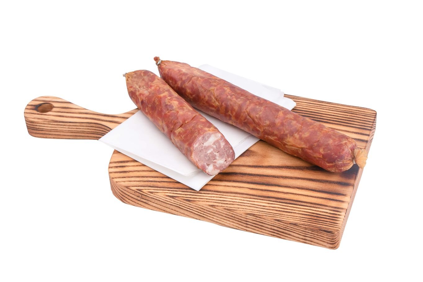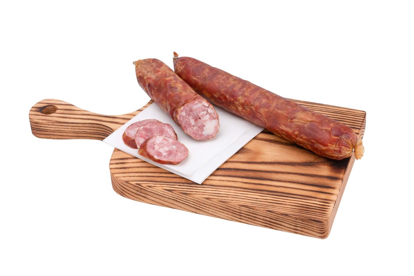 Naminė, rankų darbo dešra, puikiai tinkanti tiek džiovinimui tiek sumuštiniams ar net kepimui. Natūralios sudėties, įvilkta į natūralią žarną, todėl nereikia lupti, galima valgyti iš karto.