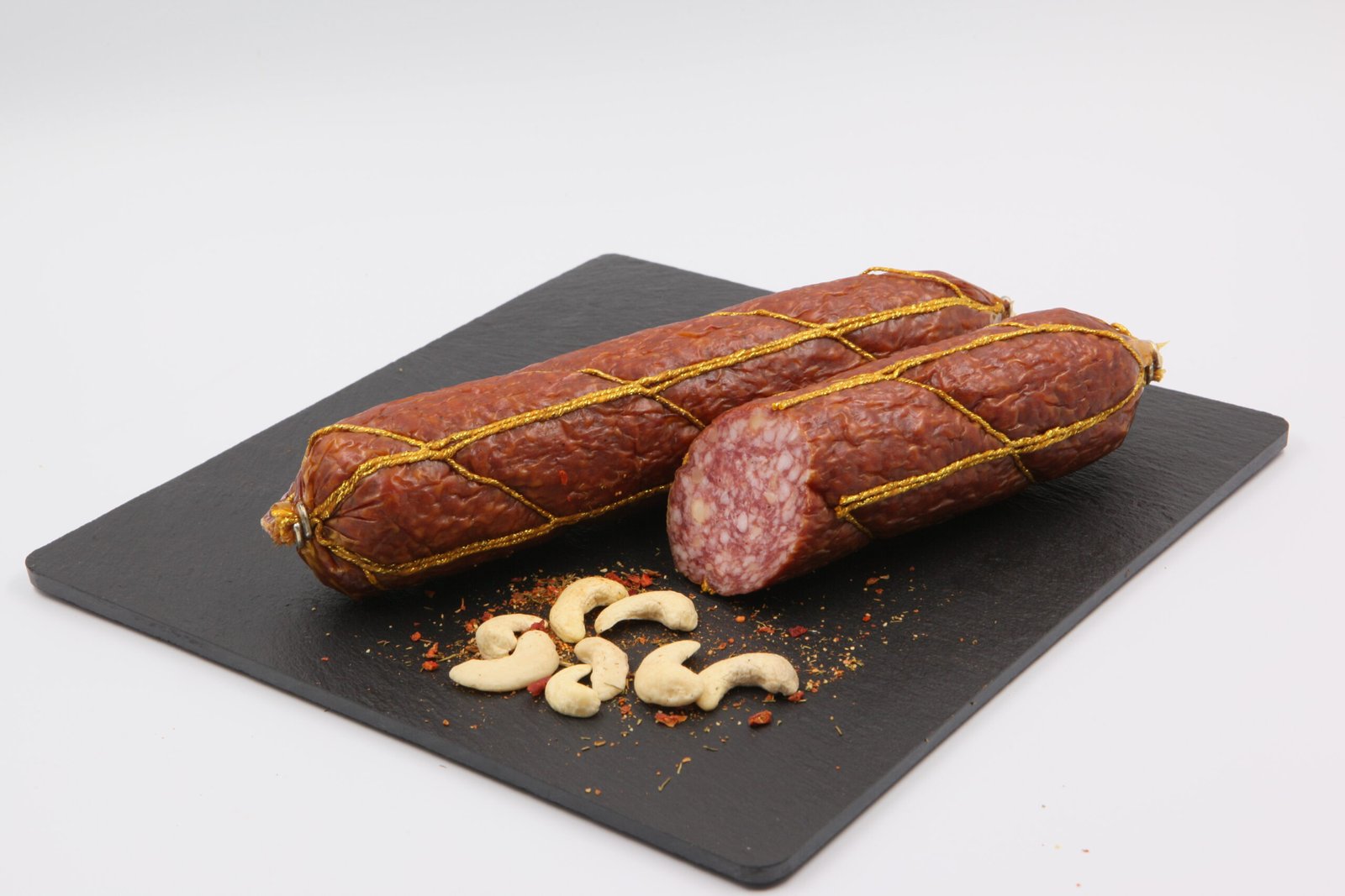 PradžiaMėsa ir kulinarija Linkuvos dešra su anakardžių riešutais, šaltai rūkyta