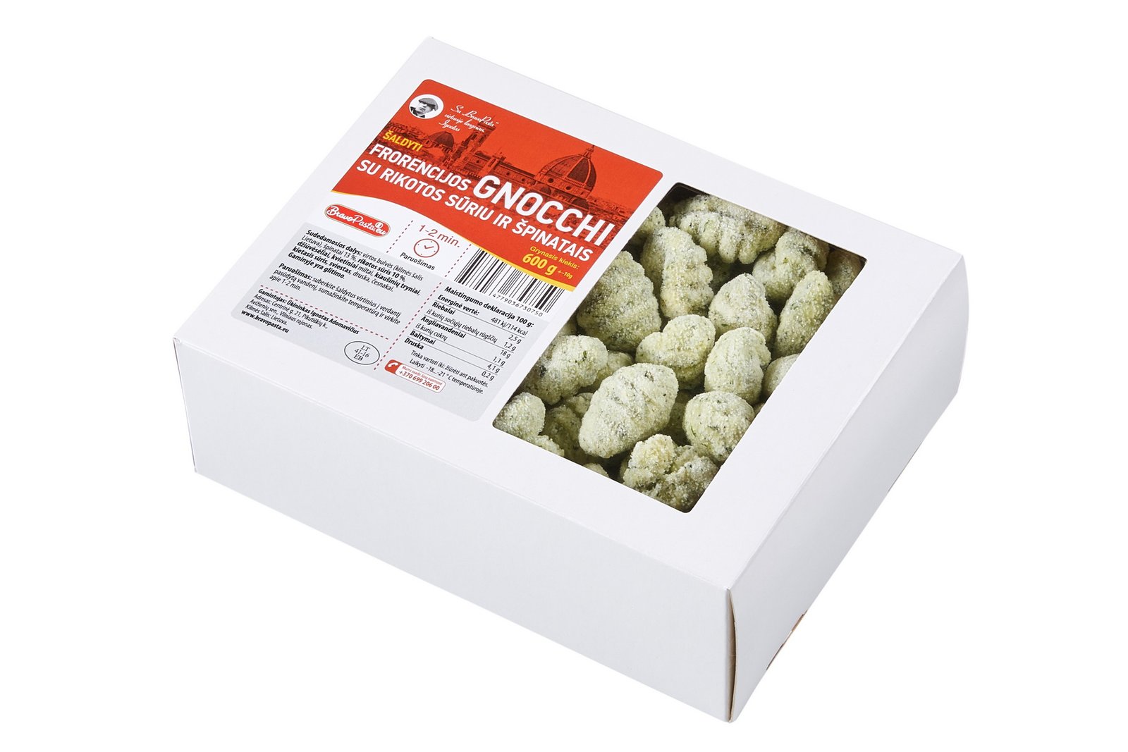 Sudedamosios dalys: bulvių dribsniai, vanduo, špinatai (13%), rikotos sūris (10%) (išrūgos, grietinėlė, druska, rūgštingumą reguliuojanti medžiaga citrinų rūgštis), ryžių miltai, sviestas, česnakai, alyvuogių aliejus, druska, juodieji pipirai. Gaminyje gali būti kiaušinių, kviečių pėdsakų. Gaminyje yra glitimo.