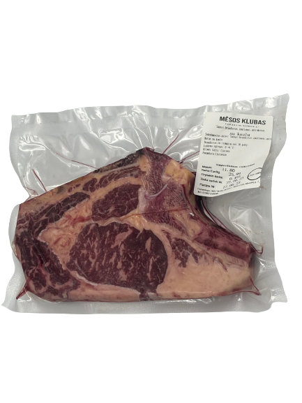 Sausai brandintas jautienos antrekotas su kaulu.